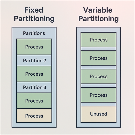 - Memory is divided into fixed-sized partitions at system boot time(The size of each partition may vary).