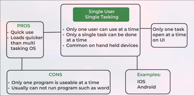 - A single-process operating system, specifically a single-user single-tasking operating system, allows only one process (or program) to be executed at a time by a single user