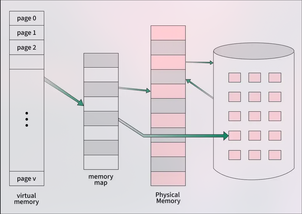 - It uses both RAM and disk storage to manage memory, loading only parts of programs into RAM as needed.
